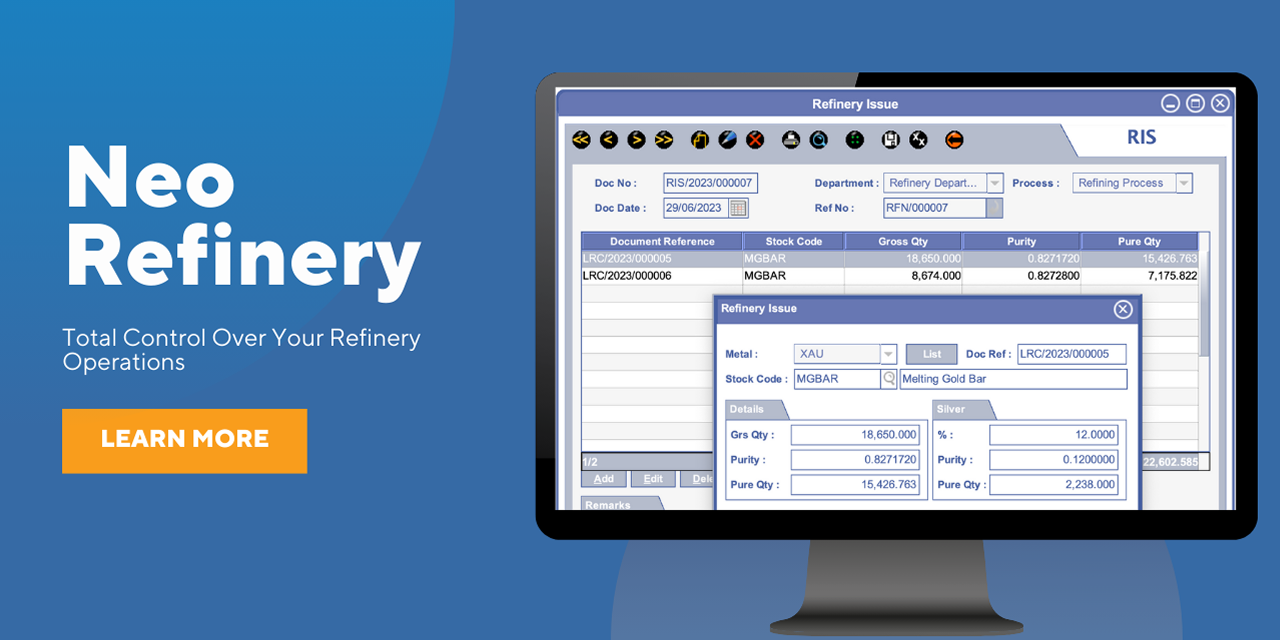 Neo Refinery is a specialized refinery operations module tailored for precious metals businesses that require accuracy and control at every stage of refining. It brings inventory movements, process tracking, assay data, and settlements into a single system, replacing fragmented workflows with structured, auditable, and efficient refinery operations.